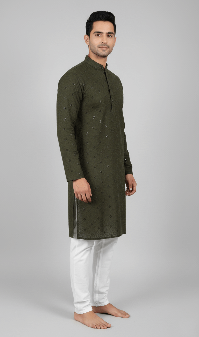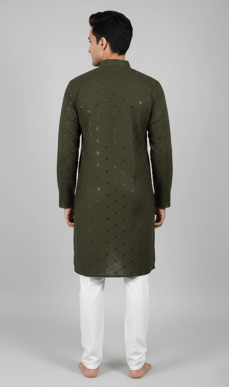 Embrace timeless elegance with our Lakhnavi Kurta in Mehndi Green, paired perfectly with a comfortable elastic white pajama. Crafted from premium cotton blend fabric, this ensemble reflects traditional craftsmanship with a modern twist. The intricate Lucknowi chikankari-inspired embroidery adds a rich texture and refined charm, making it ideal for festive occasions, family gatherings, or cultural events.